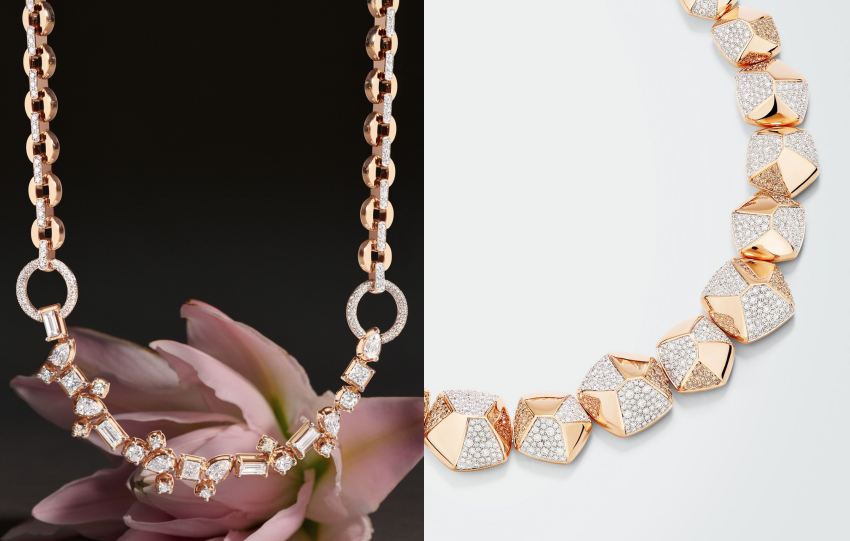 Pomellato unveiled high jewelry at Milan Fashion Week with Scala di Luce Pentagoni and Pomellato Together. Scala di Luce honors Teatro alla Scala with 266 brilliant cut diamonds and 13 fancy cut diamonds. Pentagoni explores pentagonal geometry in proprietary warm rose gold while Pomellato Together offers a three band ring with white diamonds.